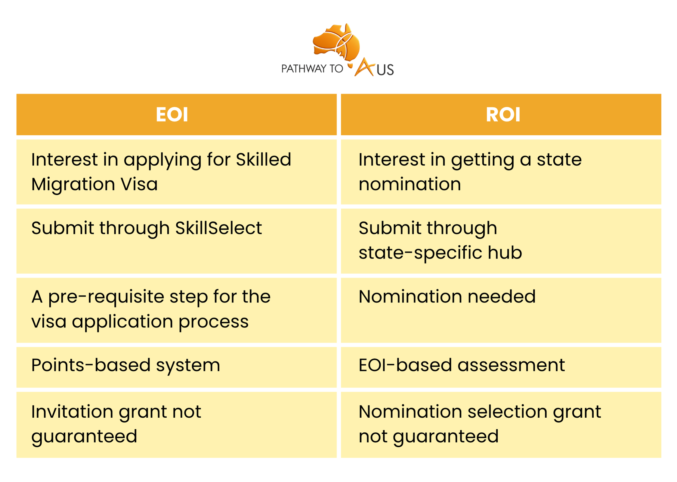 The Expression of Interest (EOI) is a statement submitted to Immigration about wanting to apply for a Skilled Migration Visa to Australia while the Registration for Interest (ROI) is made for individuals searching for state nominations.